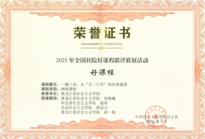 《一题三讲:从“五一口号”到协商建国》位列网络课程类“好课程”前十名。该课程由黑龙江社院牵头打造,我院和北京社院参加,以新政协诞生为主线,通过线上联动授课,重点展示了河北西柏坡和李家庄、黑龙江哈尔滨、北京香山三地在筹备新政协重大历史进程中的实践探索和现实启示,为学员提供了全新的培训体验。